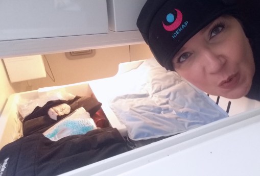 At some point, pretty much every day/night, I’ll need to ice my brain to turn down the pain signaling a bit. The top drawer of my freezer is a rather impressive collection of ice-hats, packs, and sleeves to wear, drape, wrap, or insert into pillows. The community shares new ice discoveries, we are always looking for something that’s just a little better, so I’ve got stuff from the UK, from Canada, and from around the US hanging out in my freezer. Fortunately, there is plenty of space in there since since I don’t do much of that cooking thing. One brain, nicely chilled. 😉
